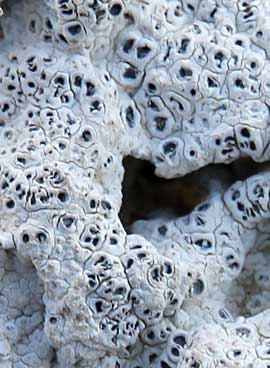Je reprends ma marche au pied de la paroi ombragée pour m’arrêter presque aussitôt. Je m’accroupi et observe attentivement de curieuses structures circonvoluées blanches qui font penser à la surface d’un cerveau. D’autres sont d’aspect un peu différent tant par la forme que par la couleur. Ce sont là des champignons lichénisés, certainement la forme de vie la plus étrange que l’on puisse rencontrer dans les Bardenas.