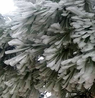 Ici, les aiguilles d'un pin d'Alep sont recouvertes d'une épaisse couche de glace née de l'association