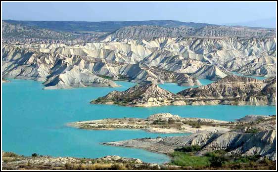 Bien que de dimension assez modeste, environ six kilomètres sur trois, le site se révèle très spectaculaire : son superbe lac contraste de façon surprenante avec les badlands décharnés qui s’étalent sur ses rives. |